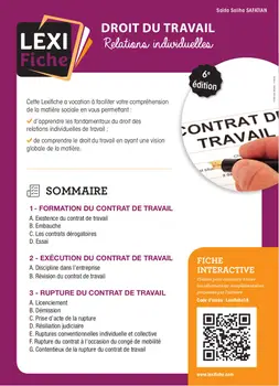 À jour des réformes essentielles du droit du travail, la Lexifiche Droit du travail, Relations individuelles est consacrée au contrat de travail à toutes les étapes de la relation professionnelle : de la conclusion du contrat à sa rupture, et ce en fonction du type de contrat de travail (CDD, CDI, contrat intérimaire?). Le format fiche s?adapte à tout lecteur : qu?il s?agisse d?un étudiant souhaitant avoir une vue d?ensemble de la matière ou d?un salarié ou d?un employeur ayant besoin d?éclaircir un point de droit précis en lien avec sa situation personnelle.