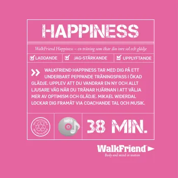 NYHET! WalkFriend - Ett helt nytt och unikt sätt att trimma hjärnan samtidigt som du tränar kroppen. Du lyssnar på WalkFriend samtidigt som du går en rask promenad, joggar eller gymtränar. Det ger dig en skonsam träningsform - helt i ditt eget tempo - och samtidigt blir du coachad av mentala tränaren Mikael Widerdal. WalkFriend Happiness tar dig med på ett underbart peppande träningspass i ökad glädje.