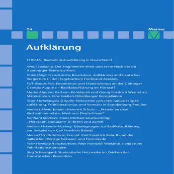Martin Mulsow, Guido Naschert Einleitung: Radikale Spätaufklärung in Deutschland. Einzelschicksale - Konstellationen - Netzwerke ABHANDLUNGEN Hamburg, Bremen Almut Spalding: Der Fragmenten-Streit und seine Nachlese im Hamburger Reimarus-Kreis Frank Hatje: Jakobiner, Demokraten, Republikaner? Französische Revolution, Aufklärung und deutsches Bürgertum in den Tagebüchern Ferdinand Benekes Göttingen, Gießen Falk Wunderlich: Empirismus und Materialismus an der Göttinger Georgia Augusta - Radikalaufklärung im Hörsaal? Martin Mulsow: Karl von Knoblauch und Georg Friedrich Werner als Materialisten - Eine Gießen-Dillenburger Konstellation Berlin und Umland Ivan-M. D'Aprile: "Mein eigentlicher Zweck geht auf eine Beschleunigung der Freiheit". Netzwerke zwischen radikaler Spätaufklärung, Frühliberalismus und Vormärz in Brandenburg-Preußen am Beispiel von Friedrich Buchholz Andreas Menk: Johann Heinrich Schulz - "Meteor an dem Kirchenhimmel der Mark von Deutschland". Über eine personelle Konstellation der Ermöglichung radikaler Religionskritik im spätfriderizianischen Preußen Reinhard Markner: Franz Michael Leuchsenring, "Philosoph ambulant" in Berlin und Zürich Halle Andrew McKenzie-McHarg: Überlegungen zur Radikalaufklärung am Beispiel Carl Friedrich Bahrdt Manuel Schulz, Marcus Conrad: Carl Friedrich Bahrdt und die halleschen Verlage Gebauer und Hemmerde Weimar Peter-Henning Haischer, Hans-Peter Nowitzki: "… gegen alles Nachtheilige bestens verwahrt". Wielands clandestine Publikationsstrategien Mainz, Stuttgart, Tübingen, Würzburg Jörg Schweigard: Studentische Netzwerke im Zeichen der Französischen Revolution. Politische Gruppenbildungen, Meinungstransfers und Symbole an süddeutschen Hochschulen (1791-1794) KURZBIOGRAPHIE Guido Naschert: Johann Georg Heinrich Feder (1740-1821) DISKUSSION Rainer Enskat: Bewährungsproben der Reflexion.