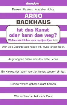 Die Ideen gehen dem kreativen Querdenker Arno Backhaus einfach nicht aus. In „Ist das Kunst oder kann das weg?“ versammelt er erneut ein absurdes Sammelsurium an Sprüchen, Aphorismen, Zitaten, Kalauern, Gedankensplittern, Sprichwörtern, Wortspielen und und und. Die ultimative Sprüche-Sammlung zum Selberlesen und Weglachen, Quer-, Nach- und um die-Ecke-Denken, zum Rätseln und Entspannen, als Ideengeber für die nächste Andacht oder Predigt, für die evangelistische Plakat-Aktion oder einfach nur zum Rumstöbern. Mal geistreich-tiefgehend, mal einfach nur witzig – aber nie ohne ein Augenzwinkern. Einfach typisch Arno!