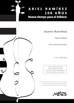 Descubre la belleza y la tradición de la música folklórica argentina con 'Juana Azurduy', una emocionante cueca norteña adaptada para cuarteto de cuerdas por el talentoso Guillo Espel. Esta versión, comisionada por SADAIC en honor al Centenario del Nacimiento del Compositor, celebra la obra de uno de los más destacados compositores de folklore argentino. Sumérgete en la riqueza cultural y el legado musical de Argentina mientras exploras las melodías cautivadoras de este icónico género. Disfruta de la interpretación magistral de músicos de renombre internacional, como Elías Gurevich, Grace Medina, Kristine Bara y Pedro Carabajal, quienes dieron vida a estas obras en un memorable concierto en el Teatro Gastón Barral de Buenos Aires. Con la inclusión de un Violín III opcional, esta edición ofrece flexibilidad para adaptarse a diferentes formaciones de cuarteto de cuerdas.