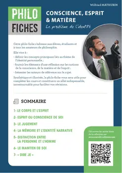 Cette philo-fiche s’adresse aux élèves, étudiants et à tous les amateurs de philosophie. Elle vise à : définir les concepts principaux liés au thème de l’identité personnelle ; fournir les éléments d’une réflexion sur les notions de la conscience, de la matière et de l’esprit ; présenter les auteurs de référence sur le sujet. Synthétique et illustrée, la philo-fiche vous sera utile pour compléter les cours et constituera un allié indispensable, incontournable pour faciliter vos révisions.