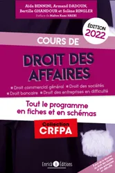 La collection CRFPA est conçue pour faciliter une acquisition rapide et progressive des connaissances. Les chapitres sont remplacés par des « fiches ». Chaque fiche est composée de trois rubriques récurrentes, conçues pour proposer trois niveaux de lectures différents : L'essentiel (résumé du cours en vingt lignes maximum) ; Les connaissances (rappel des connaissances) ; Pour aller plus loin (indications bibliographiques utiles, le cas échéant, à l’approfondissement du cours). Le programme de l’épreuve de droit des affaires est défini par l’arrêté du 17 octobre 2016 fixant le programme et les modalités de l'examen d'accès au centre régional de formation professionnelle d'avocats : I. - Commerçants et sociétés commerciales. II. - Actes de commerce. III. - Fonds de commerce. IV. - Opérations bancaires et financières. V. - Droit des procédures collectives. Le présent ouvrage de droit des affaires couvre l’intégralité du programme de l’examen d’accès au CRFPA. Résolument concret, cet ouvrage s’adresse aux étudiants de L2 ou L3, aux candidats au CRFPA ou à l’ENM, ou aux praticiens soucieux de mettre à jour leurs connaissances en droit des affaires.