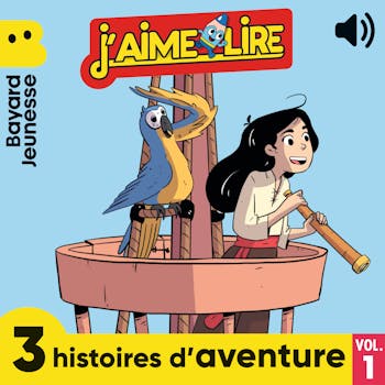 J'aime Lire - 3 histoires d'aventure, Vol. 1 - Nadhir et le dieu Cheval, Texte : Florence Reynaud. Illustrations : Antonin Faure. Voix : Sylvain Sounier - Cap sur l'ïle aux brumes !, Texte : Axelle Colau. Illustrations : Guillaume Cribeillet. Voix : Thomas Boucheny. - Le centaure et la fée des fleurs, Texte : Maëlle Fierpied. Illustrations : Sam Trouillas Guillem. Voix : Quentin Gouverneur. © Bayard Éditions, 2023.