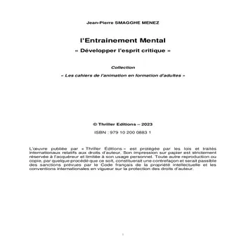 L’entrainement mental est un outil pour penser et agir sur le réel, il s’inscrit dans une démarche d’ouverture d’esprit et de développement de l’esprit critique, confrontant le savoir savant et les connaissances du quotidien. C’est une expérience pratique dont personne ne devrait se priver. La collection « Les cahiers de l'animation en formation d'adultes » s'adresse aux formateurs désirant mettre en œuvre une animation pouvant à la fois être proposée aux apprenants comme introduction ou comme conclusion d'une séquence d'apports théoriques. Son objectif est de proposer sous un angle pratique des techniques favorisant les apprentissages clefs ou transversaux communs à plusieurs domaines de la formation professionnelle.