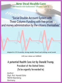 This ebook is an adaption of a totally new healthcare system to US economy. Worked out by the German author to finish the long-lasting quarrel within the bipartisan political system in USA and to solve the problems bipartisan. This means covered pre-existing conditions. No medical surprise bills. Free choices of doctors or treatments. Open to all (Americans) and affordable for everyone. Totally reflow of indirect taxes to private health accounts. And the greatest promise: decreasing state debts! These are only some claims of the German author. This healthcare is not a normal healthcare system or insurance: The whole system is a social market economy embedded in the national economy.The author took notice during the heated up presidential race in 2016. And the announcements of now-President Trump that he wants to repeal and replace (old-fashioned) Obamacare and that he is also prepared to implement a new idea too. This and the fact that A prophet has no honor in his own country was prompting the German author to work on this adaption. This New Deal Healthcare entitled as Social Double-Account-System with Three-Column-Funding with free prices and money administration by the citizens themselves received President Trump on January 27, 2017 by registered letter. Some explanations were following during the last years through emails.