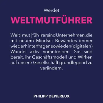 Welt | mut | füh | rer sind Unternehmen, die mit neuem Mindset Bewährtes immer wieder hinterfragen sowie den (digitalen) Wandel aktiv vorantreiben. Sie sind bereit, ihr Geschäftsmodell und Wirken auf unsere Gesellschaft grundlegend zu verändern.