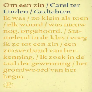 Als observator is Carel ter Linden gefascioneerd door de wereld om hem heen. Zo boeit de nachttrein hem omdat de reiziger het duister in gaat en zich volkomen overgeeft aan een geheimzinnige bestuurder die hij totaal niet kent. Een mol - dat vreemde dier dat nooit het daglicht ziet - roept bij Ter Linden de vraag op of de mens misschien even blind is voor het hogere dat hém omgeeft. De titel van deze bundel is Om een zin . Een goed alternatief zou 'Om een laatste zin' zijn geweest. Een aantal gedichten verraadt immers zijn zoektocht naar zo'n laatste zin, waarmee de dichter raakt aan de zin van het leven zelf. De bundel is opgedragen aan de nagedachtenis van zijn vrouw, aan wie een aantal gedichten zijn gewijd. Gebruikmakend van klassieke vormen en trefzeker formulerend schrijft Ter Linden een ingetogen, herkenbare poëzie die veel lezers zal aanspreken.