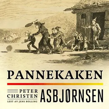 "Det var engang en kone som hadde syv sultne unger, og dem stekte hun pannekaker til. Det var råmelks-kake, den lå i pannen og este seg så tykk og god, og ungene sto omkring, og gamlefar satt og så på. "Å, la meg få litt pannekake, mor mi, jeg er så sulten," sa den ene ungen. "Å kjære deg," sa den andre. "Å kjære, vene deg," sa den tredje. "Å kjære, vene, snille deg," sa den fjerde. "Å kjære, vakre, vene, snille deg," sa den femte. "Å kjære, vakre, vene, gode, snille deg," sa den sjette. "Å kjære, vakre, vene, gode, snille, søte deg," sa den syvende, og så ba de om pannekake alle sammen, den ene vakrere enn den andre, for de var så sultne og snille. "Ja, barna mine, bi nå bare til den vender seg," sa hun - til jeg får vendt den, skulle hun sagt - "så skal dere få pannekake alle sammen; se bare hvor tykk og velnøyd den ligger der." Da pannekaken hørte dette, ble den redd, og rett som det var, så vendte den seg av seg selv og ville ut av pannen; men den falt ned igjen på den andre siden, og da den hadde stekt seg litt på den også, så den ble fastere i fisken, spratt den ut på gulvet og trillet avsted som et hjul ut gjennom døren og bortetter veien."