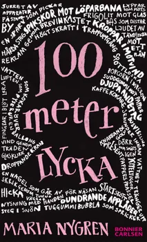 "Utanför hörs publikens taktfasta applåder. När jag går mot den strålkastarupplysta arenan ser jag hur min kropp avtecknar sig som en jättelik svart silhuett på den vita väggen. Jag rullar armarna bakåt och går sakta mot startblocket."100 meter lycka är berättelsen om 17-åriga Ninna. Hon har det svenska rekordet på 100 meter och när hon springer är det som att hon flyger. Samtidigt ligger hon sjuk och orörlig i ett mörkt rum, hennes kropp har börjat angripa sig själv och hon blir allt sämre. Båda de här två världarna är lika verkliga för Ninna, hon lever både i drömmen och i verkligheten. Men så plötsligt förändras allt. En ung kille börjar i hemtjänsten. Munir med den utmanande blicken och det självklara sättet. Han som tror att Ninna kan bli frisk och som helt rubbar balansen i Ninnas familj. Nu börjar de två världarna att allt mer blandas samman och ingenting kommer någonsin att bli sig likt.
